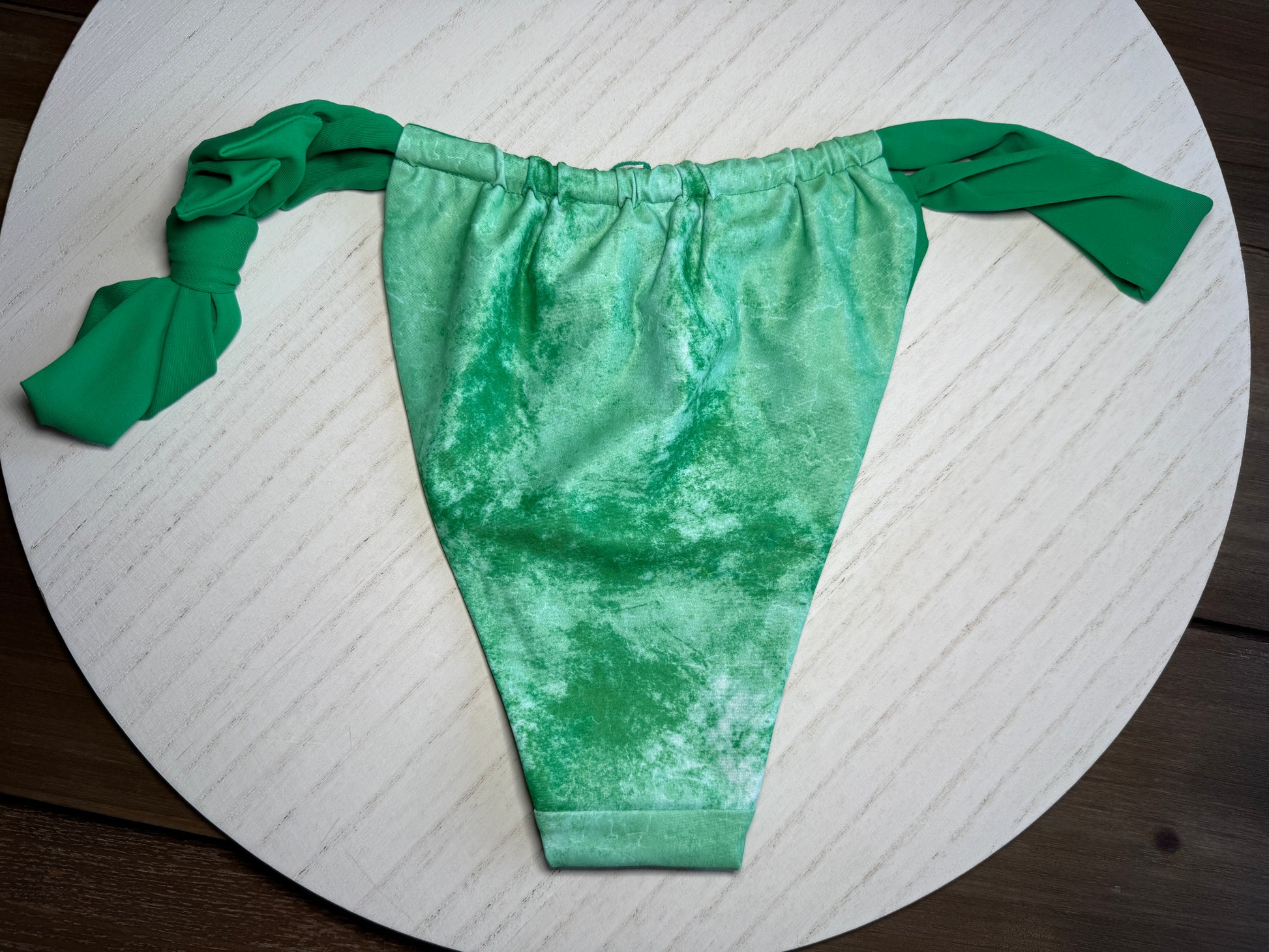 Our Sea Foam collection is reversible. A fun tie-die of green hues and a solid, dangerously bold green. Made from partially recycled material, this adjustable fav ties on one side, so you never have to fight over one side being too loose. Wear them low or high and choose the coverage you want - how cheeky do you feel?